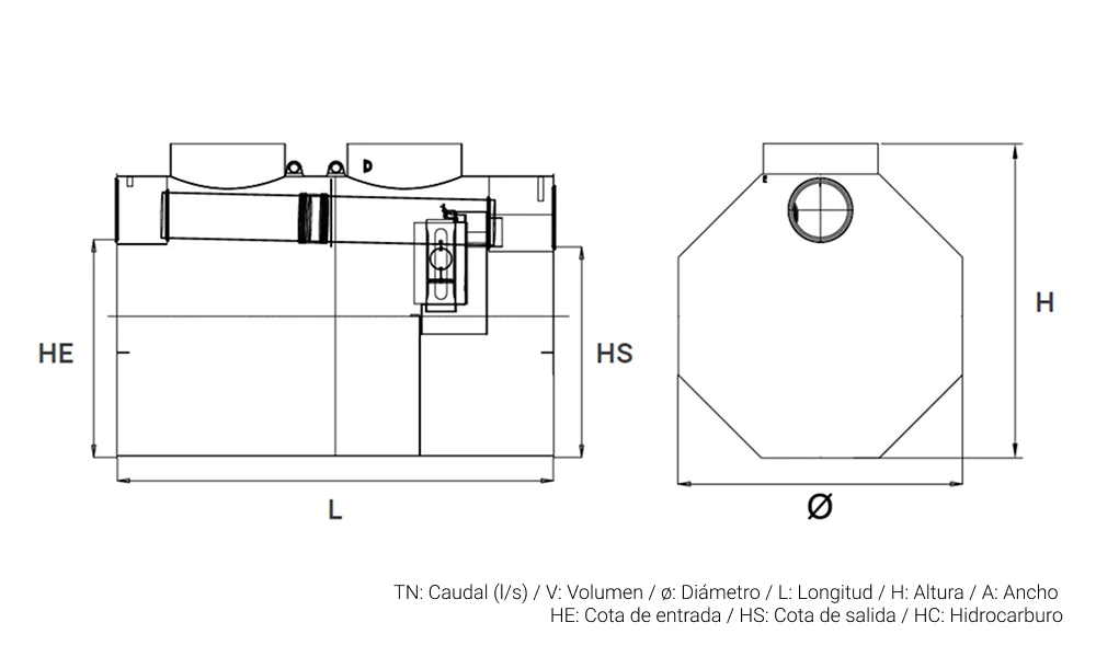 • El compartimento del separador de hidrocarburos está dimensionado para obtener un vertido inferior a 5 mg/L según los ensayos determinados por la norma EN 858-1.