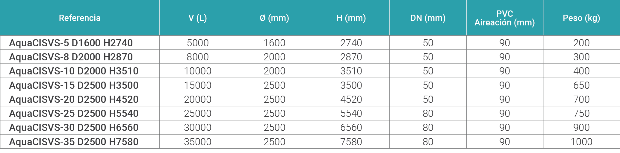 • 2 Tubuladuras en PVC: DN50: 8-20 m³, DN80: 21- 60 m³, DN 100: 61- 250 m³.