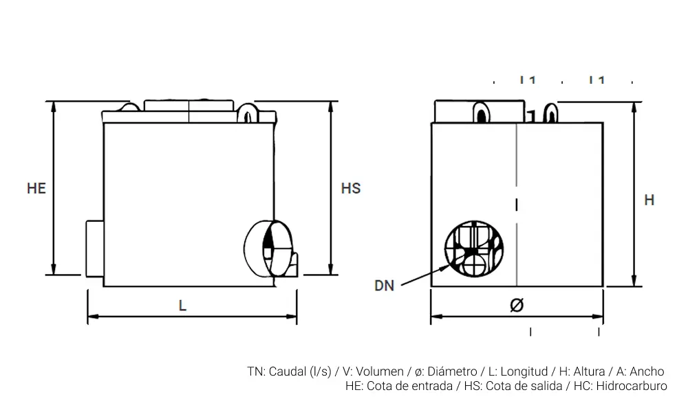 Tras la instalación, realizar una arqueta de hormigón. Puede solicitar el plano correspondiente. Cotas HE y HS definidas en el pedido y validación del plano de implantación.