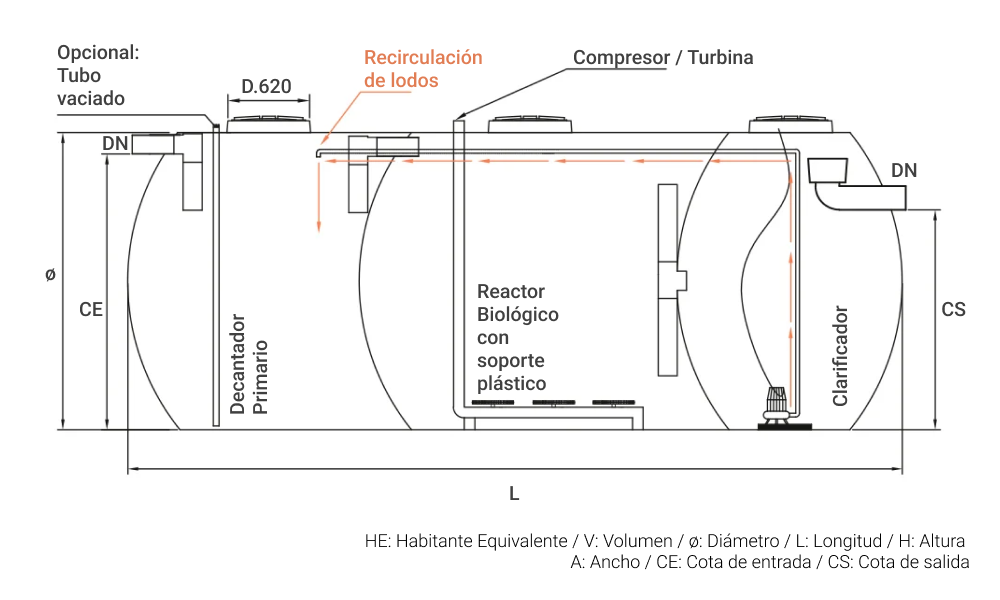 La depuración de las aguas se realiza mediante la combinación de dos tecnologías: lodos activados y fijación de la biomasa sobre un soporte, conocido como Moving Bed Biofilm Reactor-MBBR. De este modo se favorece el crecimiento de la biomasa en soportes plásticos de alta superficie específica, que se encuentran en suspensión en el reactor biológico, por aireación. Esta combinación de procesos ofrece una solución robusta y eficaz. El sistema se completa por un Decantador Primario previo para retener las partículas de mayor tamaño y los flotantes y de un clarificador al final del proceso, para obtener un efluente de elevada calidad de depuración. Los fangos decantados estabilizados se recirculan al primer compartimiento para disminuir la frecuencia de vaciados y reducir los costes de