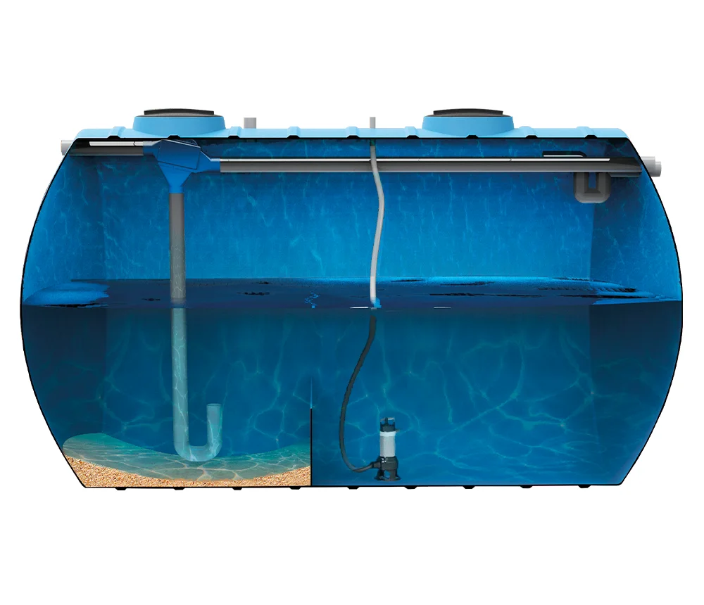 Depósitos y cisternas de aprovechamiento de aguas pluviales con filtro integrado.
